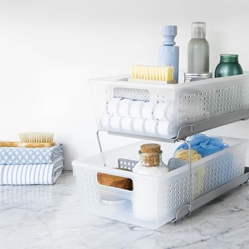 Transform your chaotic bathroom cabinet into an organized sanctuary with the madesmart 2-tier undersink organizer that doubles your storage capacity. Two sliding baskets with adjustable dividers let you customize compartments for everything from cleaning supplies to toiletries, while the durable BPA-free construction ensures years of smooth operation. Picture opening your cabinet to find everything perfectly sorted and within easy reach instead of digging through cluttered shelves.