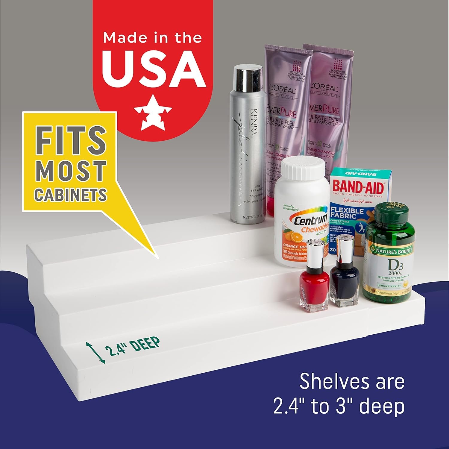Manufactured in the USA by Dial Industries, the unit extends from 14 to 27 inches, adapting effortlessly to most kitchen cabinet organizer setups. Each of the three tiers is thoughtfully sized, giving instant access to your canned goods or spice rack items.