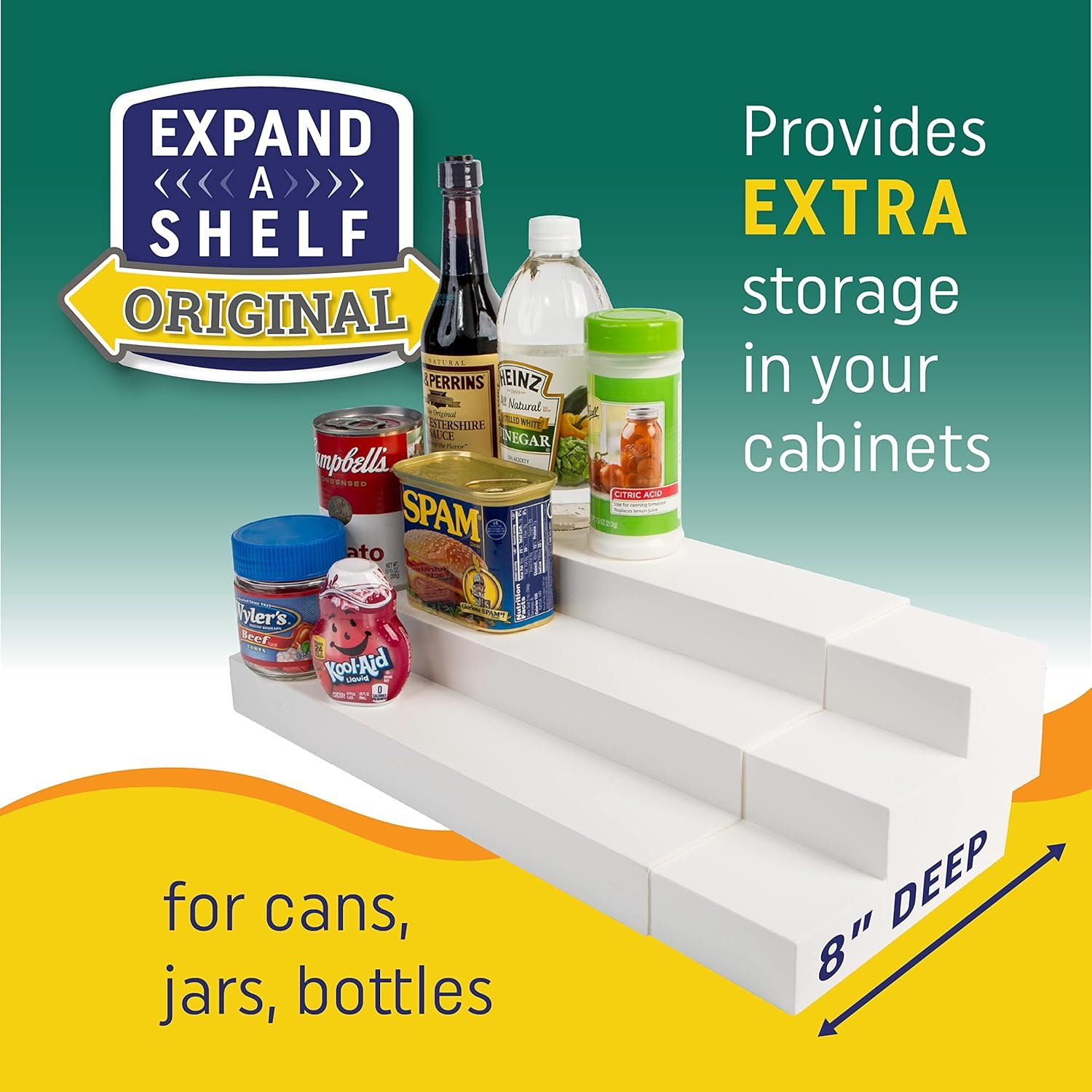 Compared to popular options like the SimpleHouseware Stackable Can Rack and YouCopia ShelfSteps, this product stands out for its expandable width and deeper tiers. Unlike traditional spice rack units, it can accommodate both tall cans and smaller jars, offering more versatility for kitchen cabinet organizer scenarios.