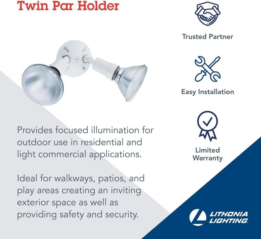 Enhance your home's safety and security with the Lithonia Lighting Outdoor Flood Light Fixture, a durable and adjustable twin PAR flood light holder perfect for residential or light commercial use. Featuring weather- and rust-resistant die-cast aluminum construction and tool-free adjustable heads, this fixture provides reliable, focused lighting where you need it most. Easy to install and compatible with standard 120V junction boxes, it's ideal for driveways, patios, and more. Trust Lithonia Lighting for high-performance outdoor lighting and peace of mind.