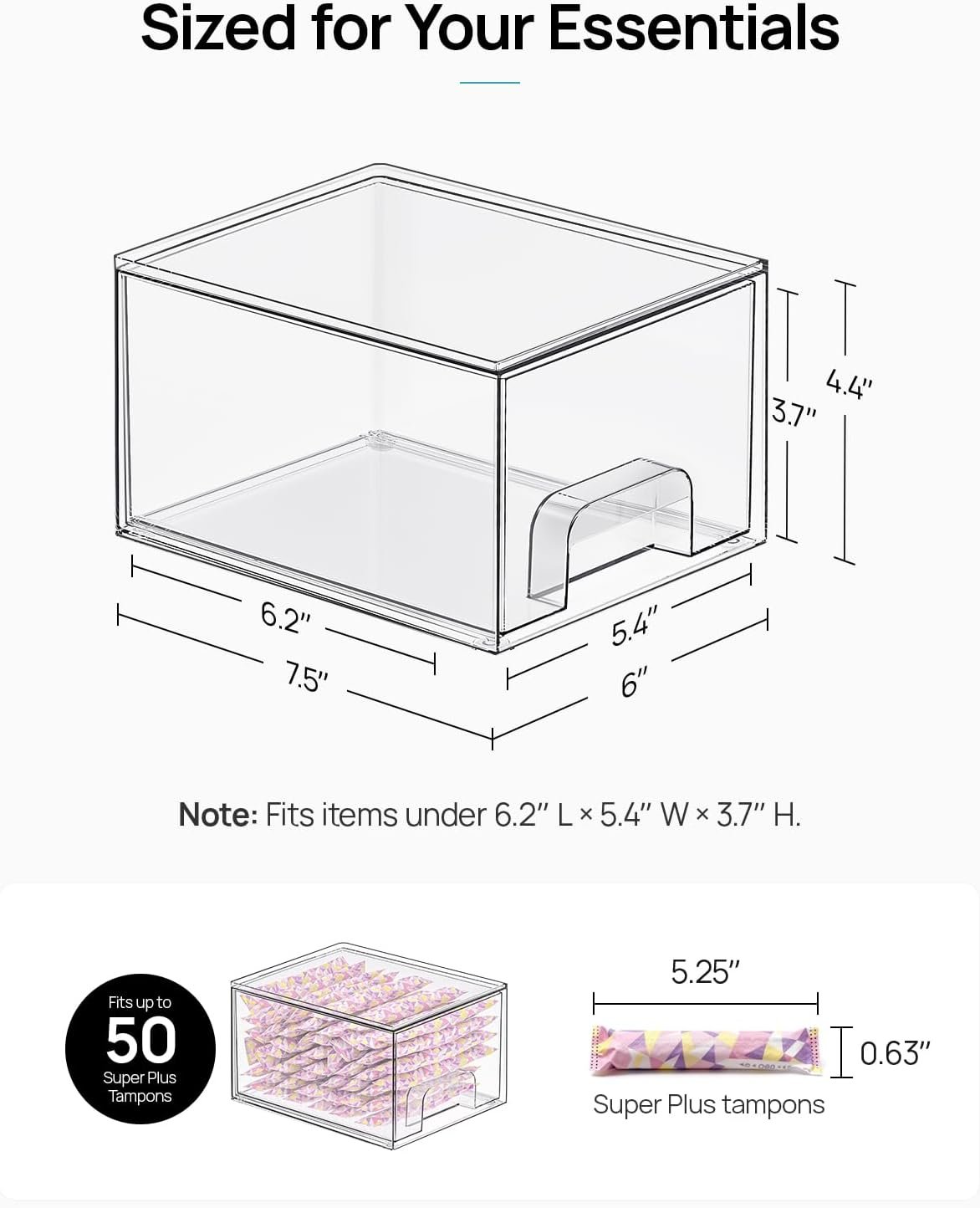 Each unit measures 7.5 inches deep by 6 inches wide by 4.4 inches tall. The crystal-clear acrylic construction lets you see everything inside at a glance. This is a game-changer for anyone tired of digging through opaque bins to find their favorite lipstick or skincare product.