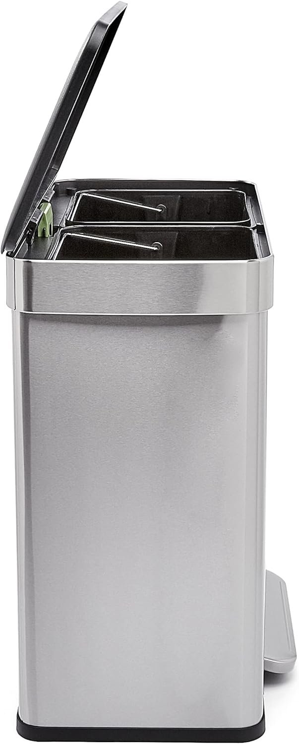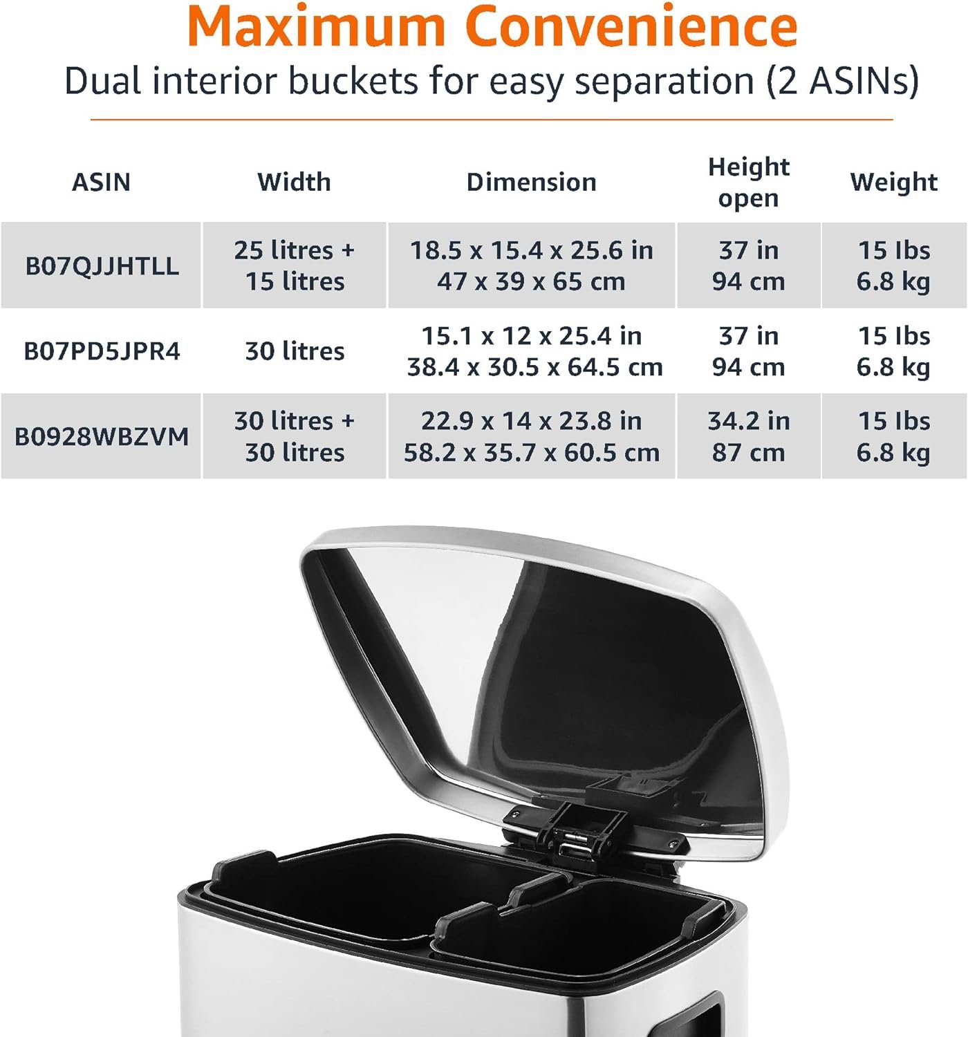 Comparing this product to top-rated models like the simplehuman Butterfly Lid Dual Compartment Recycler and the Joseph Joseph Totem Compact, Amazon Basics holds its own with a similar large capacity and durable stainless steel exterior. It’s often more affordable and provides comparable soft-close functionality—though others offer features like split lids for tight spaces.